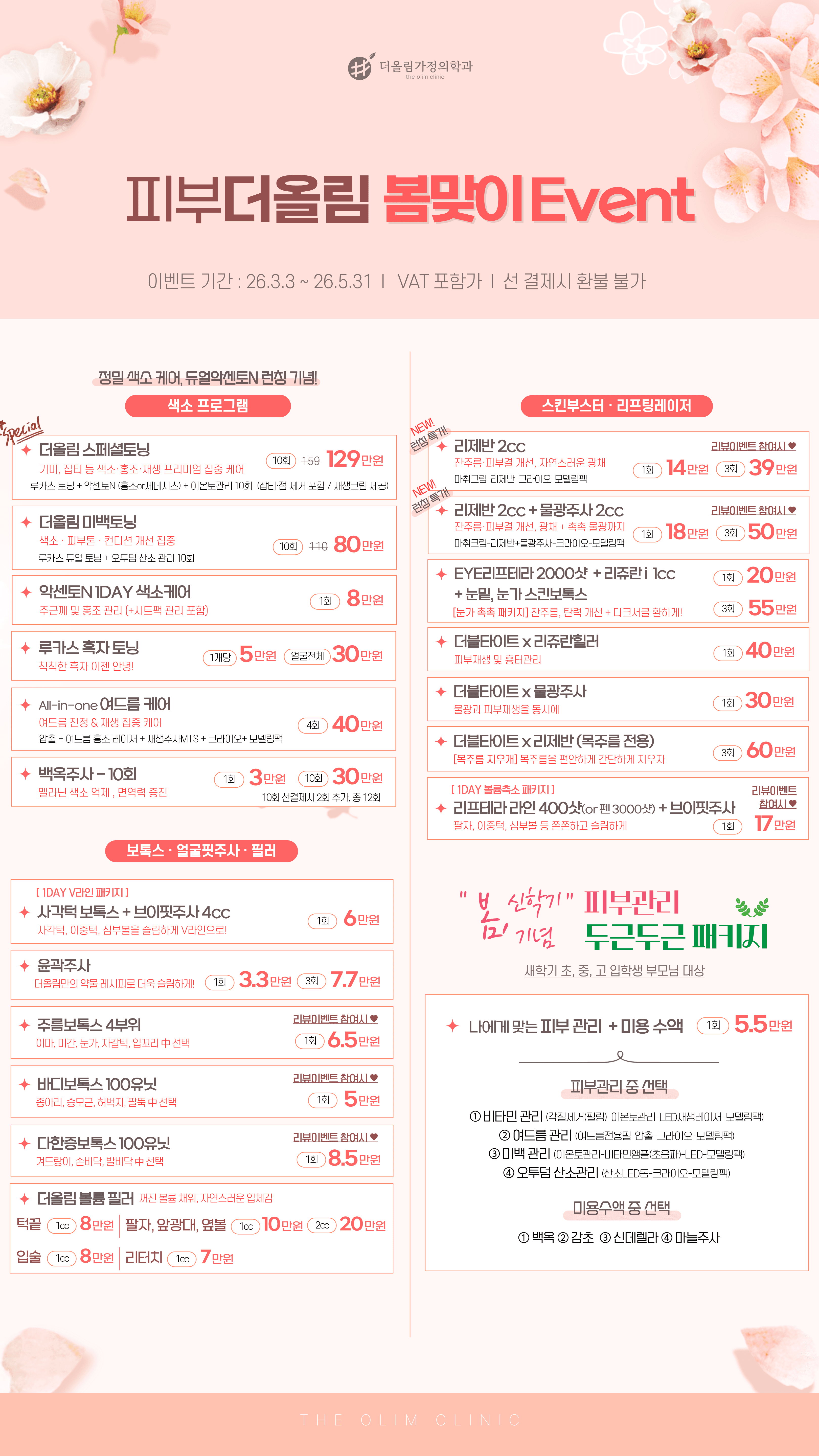 더올림에서는 환자분들의 편리한 상담과 진료를 위해 다양한 이벤트 혜택을 운영하고 있습니다. 예약 시 ‘이벤트 예약’이라고 남겨주시면 보다 빠른 상담이 가능하며, 상황에 맞는 맞춤 안내도 함께 받아보실 수 있습니다.