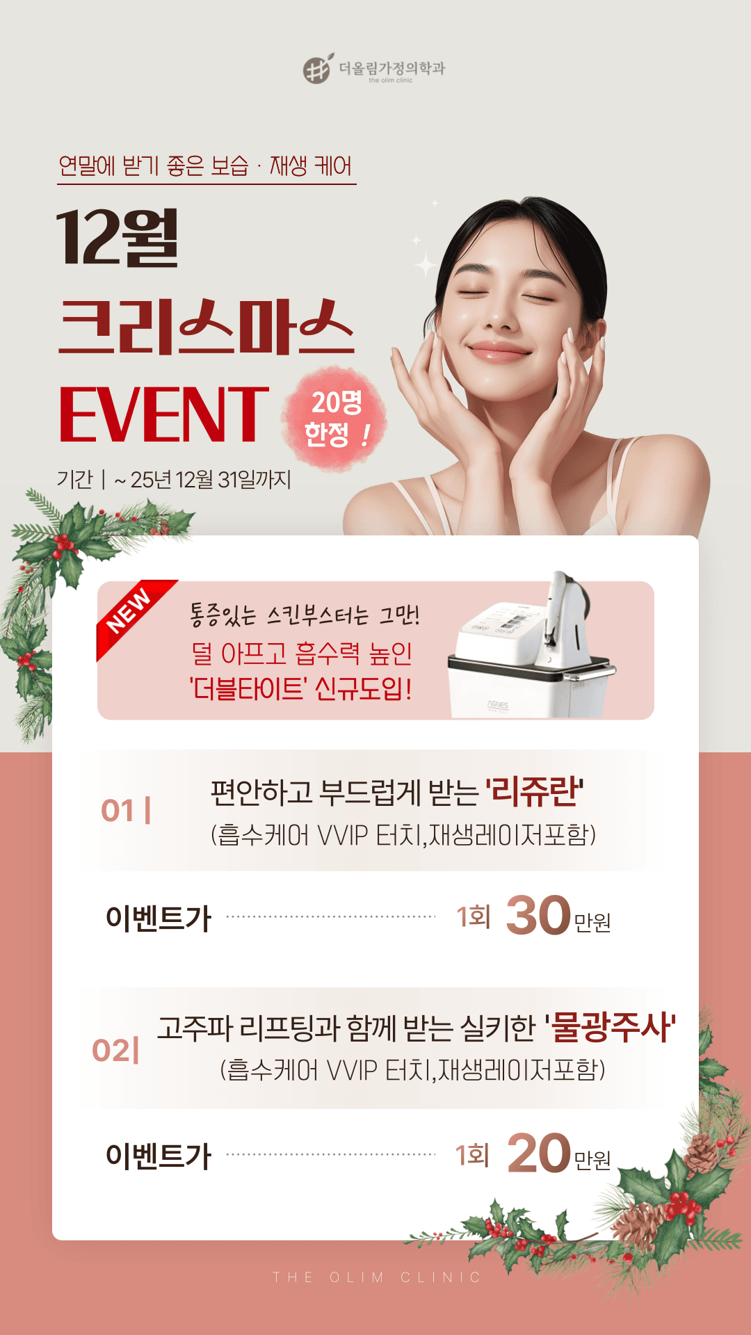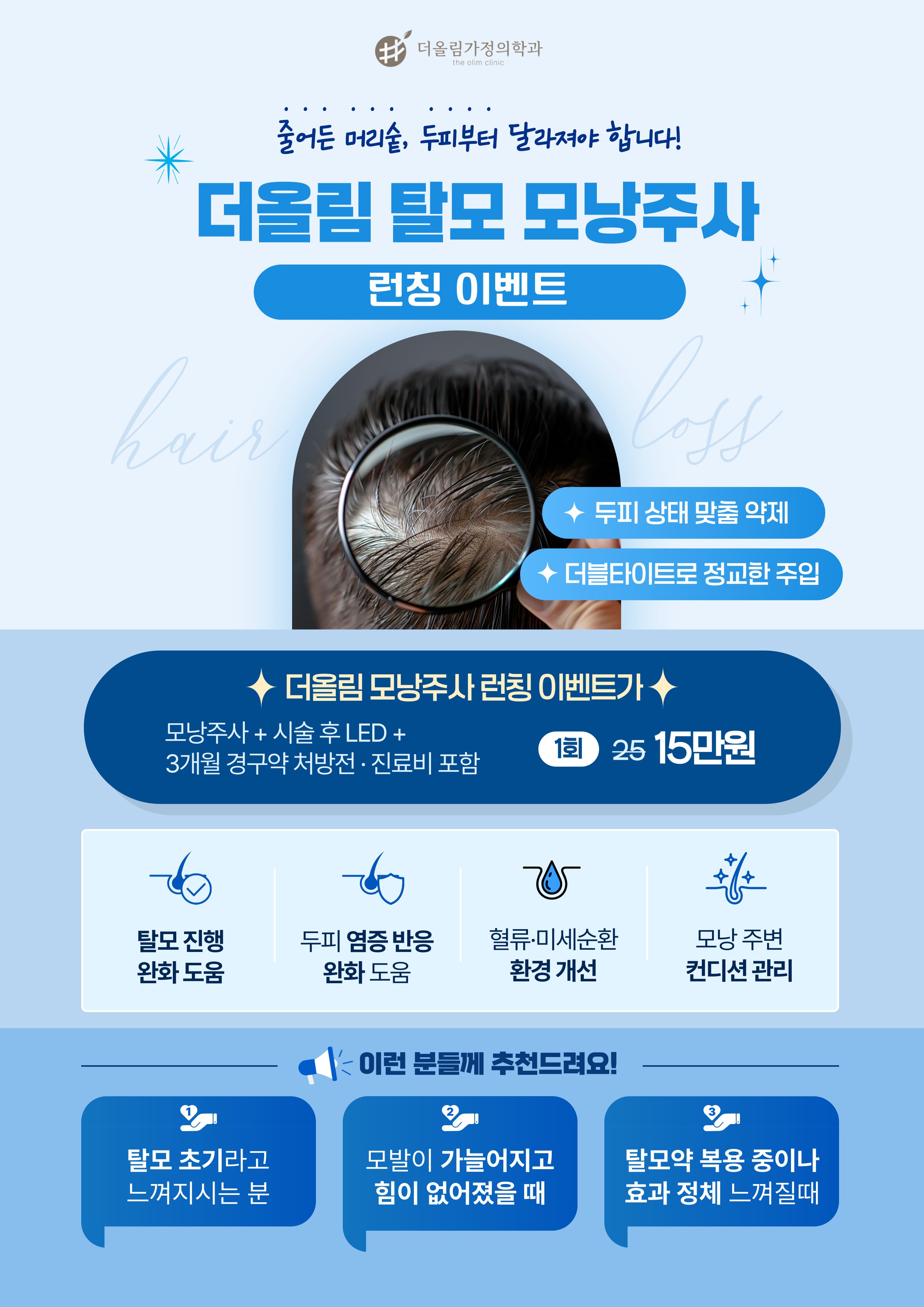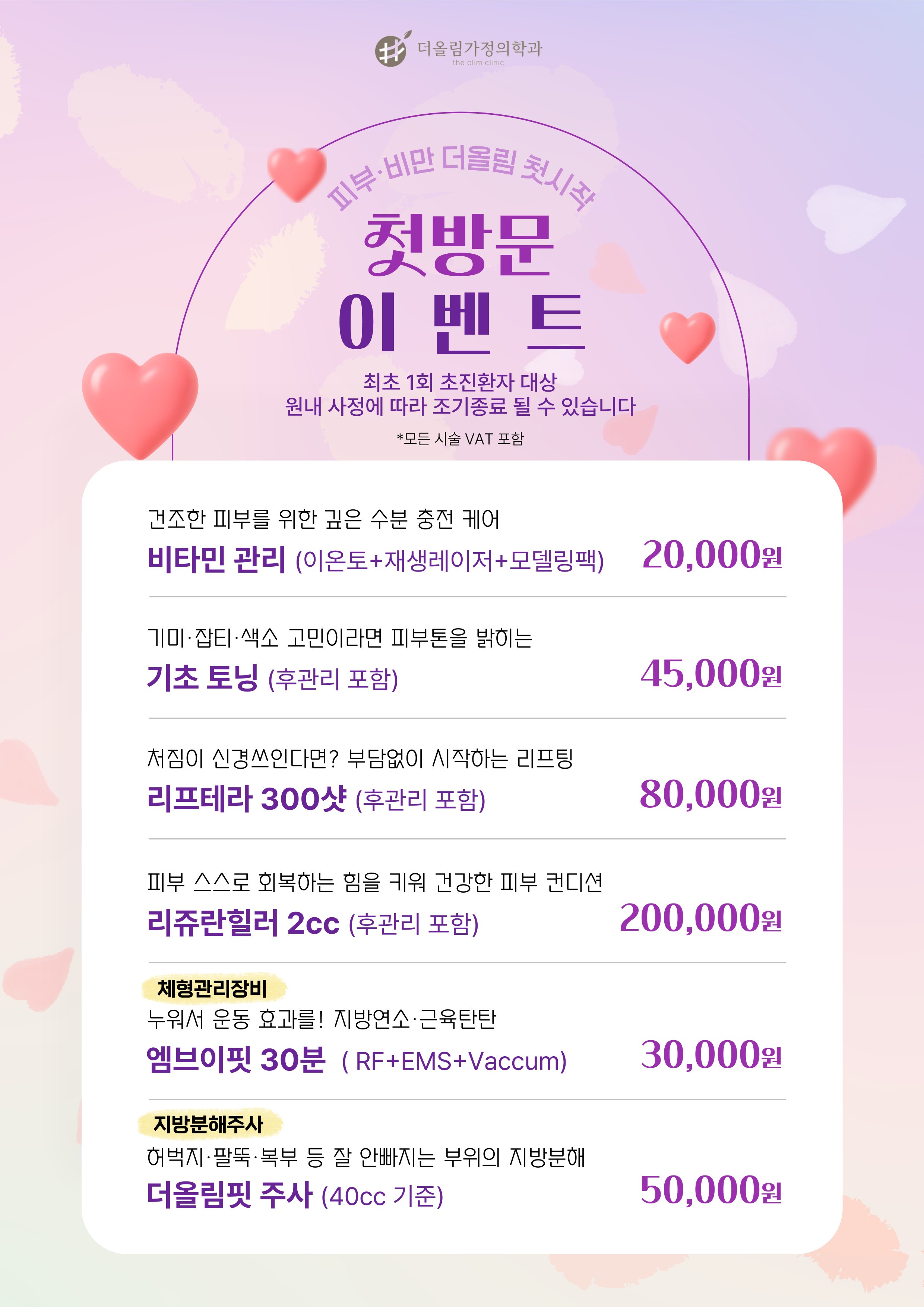 더올림가정의학과는 환자의 몸이 보내는 신호에 귀 기울이고, 그에 꼭 맞는 해결책을 찾아갑니다. 피로와 면역력 저하부터 피부 고민, 체형 관리까지 일상에서 마주하는 건강 이슈를 다각도로 살피며, 단순한 시술을 넘어 삶의 질을 높이는 진료를 지향합니다.